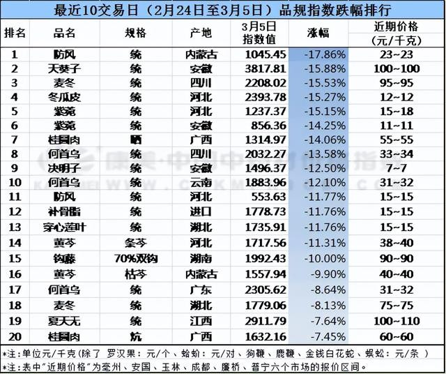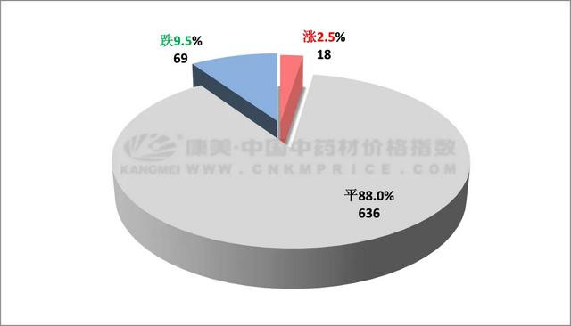 近10日,中药材价格指数品规上涨的有18个,69个下跌,持平有636个。涨跌范围在-17.86%~28.57%之间。