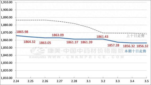 2025年3月5日总指数止于1856.32点,比10日前(2025年2月23日)下降了11.9点,下降幅度为0.64%,较上期跌幅减弱0.6个百分点。