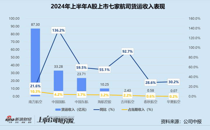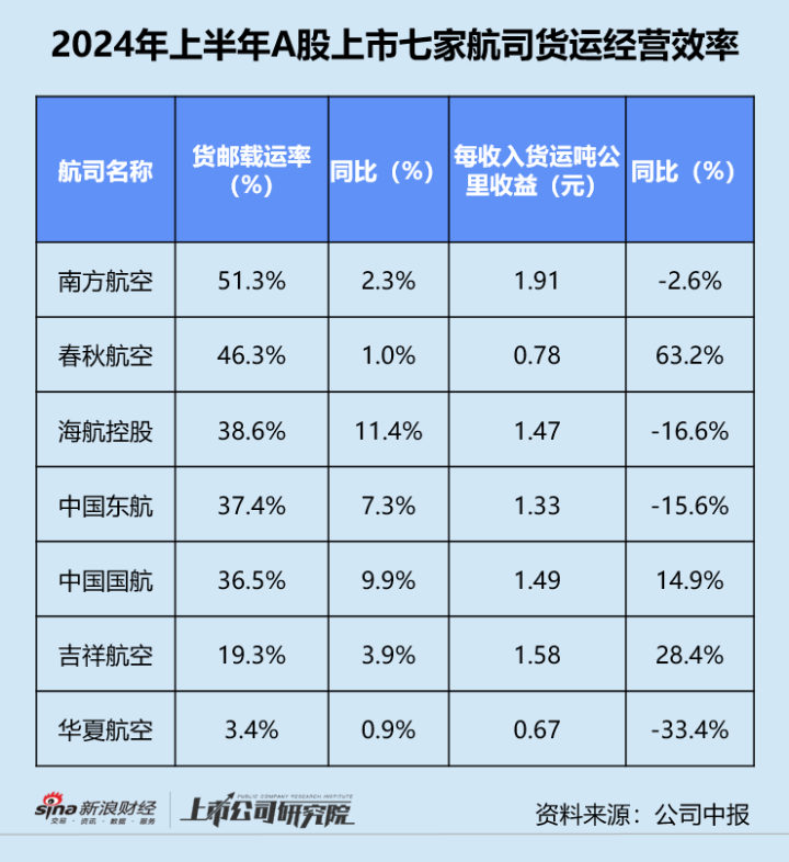 就经营效率而言,七家航司的平均货邮载运率约为33.3%。具体来看,南方航空排名第一,录得51.3%,同比增加2.3%。春秋航空紧随其后,货邮载运率约为46.3%,与2023年同期基本持平。海航控股同比增幅超11%,平均载运率约为38.6%,而华夏航空载运率只有区区3.4%,较2023年上半年仅提高0.9个百分点。