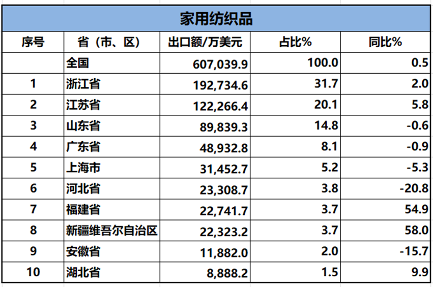 2024年1-4月,我国纺织服装累计出口898.44亿美元,同比增长0.3%。内地31个省、自治区、直辖市纺织服装统计数据已出炉,浙江省、江苏省、广东省、山东省、福建省分别列全国纺织服装出口省市前五位,合计比重超七成。