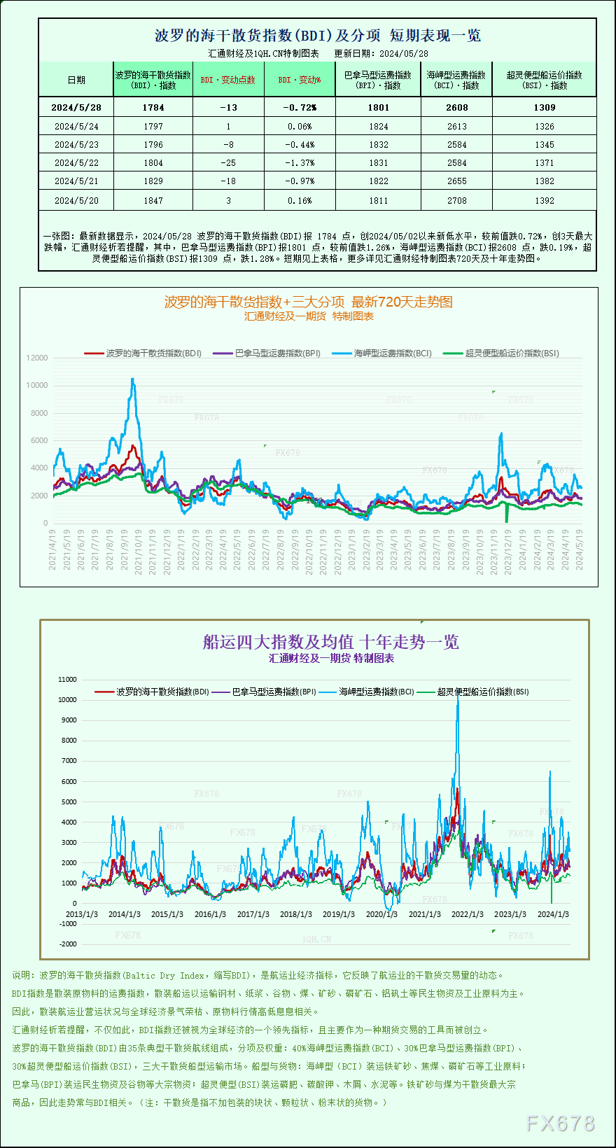 汇通财经APP讯——最新数据显示,2024/05/28波罗的海干散货指数(BDI)报1784点,创2024/05/02以来新低水平,较前值跌0.72%,创3天最大跌幅,其中,巴拿马型运费指数(BPI)报1801点,较前值跌1.26%,海岬型运费指数(BCI)报2608点,跌0.19%,超灵便型船运价指数(BSI)报1309点,跌1.28%。波罗的海干散货指数+三大分项的最新720天走势图、十年走势图等详见汇通财经特制图表。